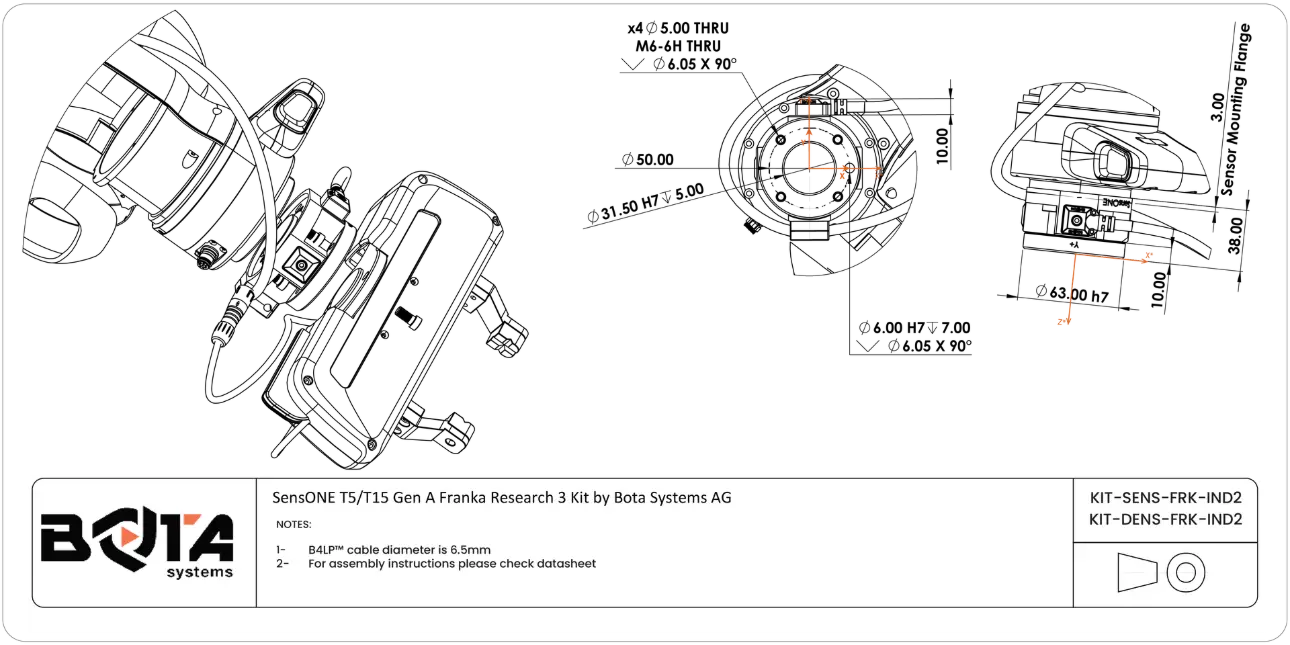 Integration kit for the Franka FR3 robot featuring our SenseONE 6-axis force torque sensor includes all components and cabling for fast setup and precision force control.